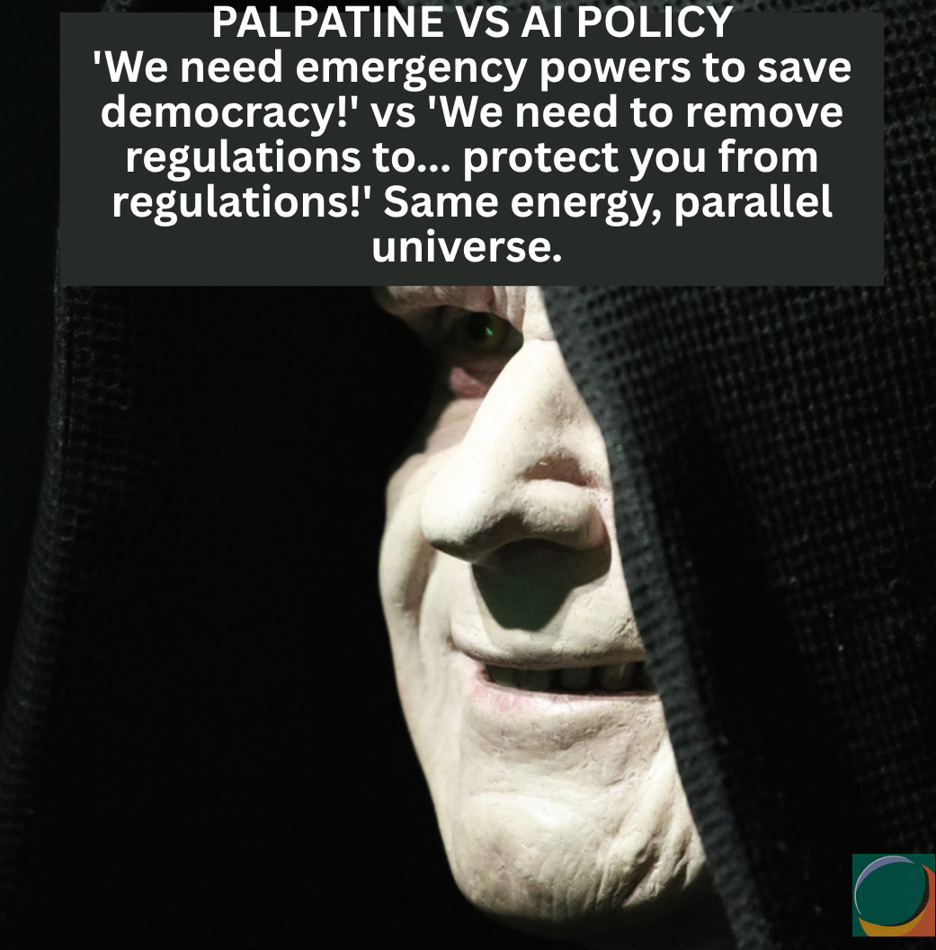 Remember when Palpatine convinced everyone he needed "emergency powers" to save democracy? Yeah, well meet the AI Action Plan: "We need to remove regulations to..... protect you from regulations!"